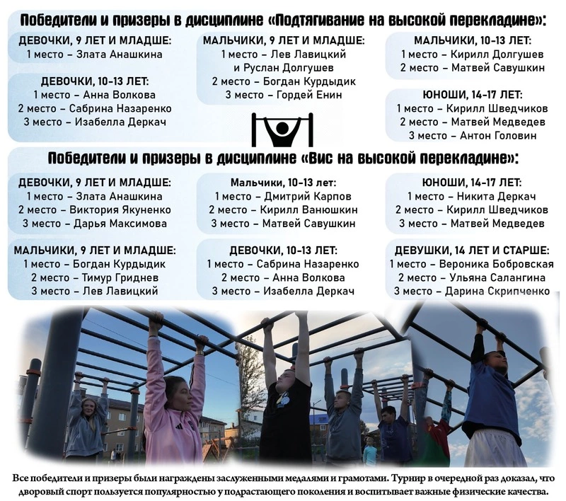 По итогам состязаний двое участников, показавшие наилучший абсолютный результат в своих дисциплинах, были удостоены специальных кубков. Абсолютным чемпионом в подтягиваниях стал Кирилл Шведчиков, а в висе на перекладине сильнейшим оказался Богдан Курдыдик.