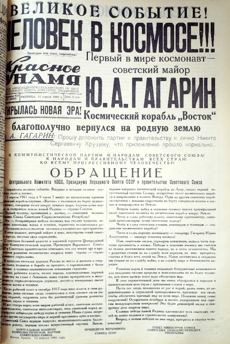 14 апреля 1961 года жители Александровск-Сахалинского района достали из своих почтовых ящиков газету, где большинство полос были посвящены одному событию, которое буквально взорвало весь мир. Человек в космосе!!! Открылась новая эра!